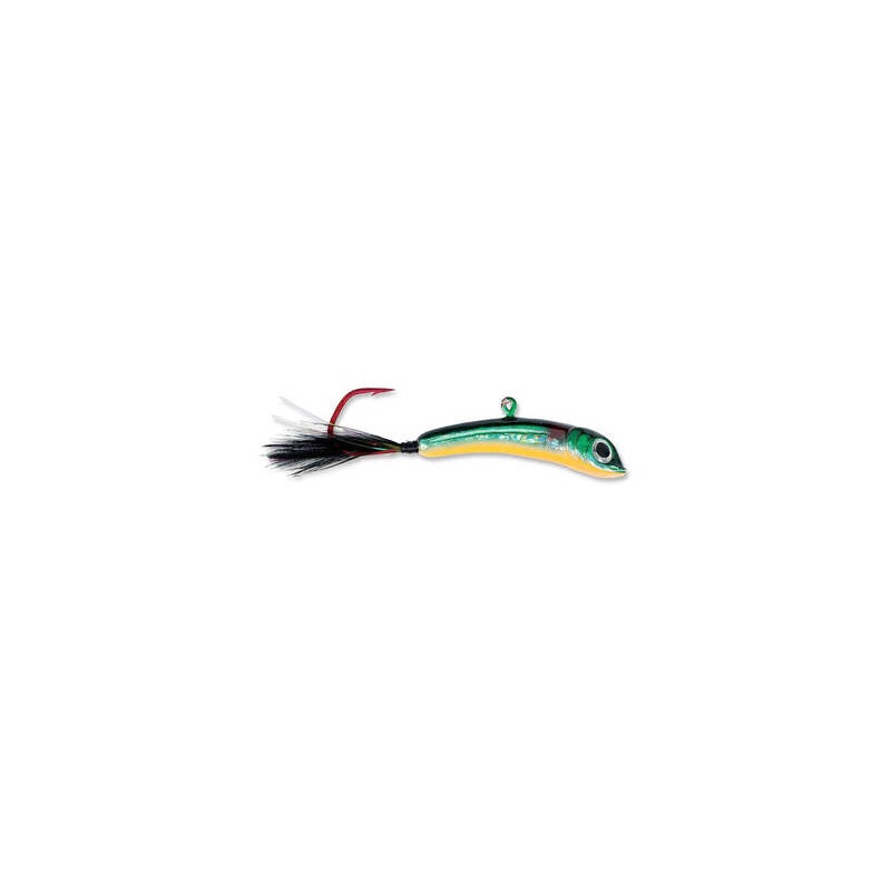 Perfect for pounding bottom or fishing for suspended fish during winter and open water conditions. The Jigging Minnow mimics an active minnow in a feeding position. One of the best vertical jigging lures, with holographic eye, naturalistic colours, dressed feather tail, and red VMC Barbarian hook.