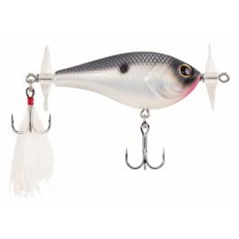 Berkley Spin Bomb Prop Bait is ideal for those situations when the bass are up shallow feeding on baitfish and bluegill. Built with a smaller baitfish inspired body shape, the Berkley Spin Bomb Prop Bait features two large cupped plastic propellers that dont require any tuning and spray the maximum amount of water at any speed thanks to their enhanced surface area.