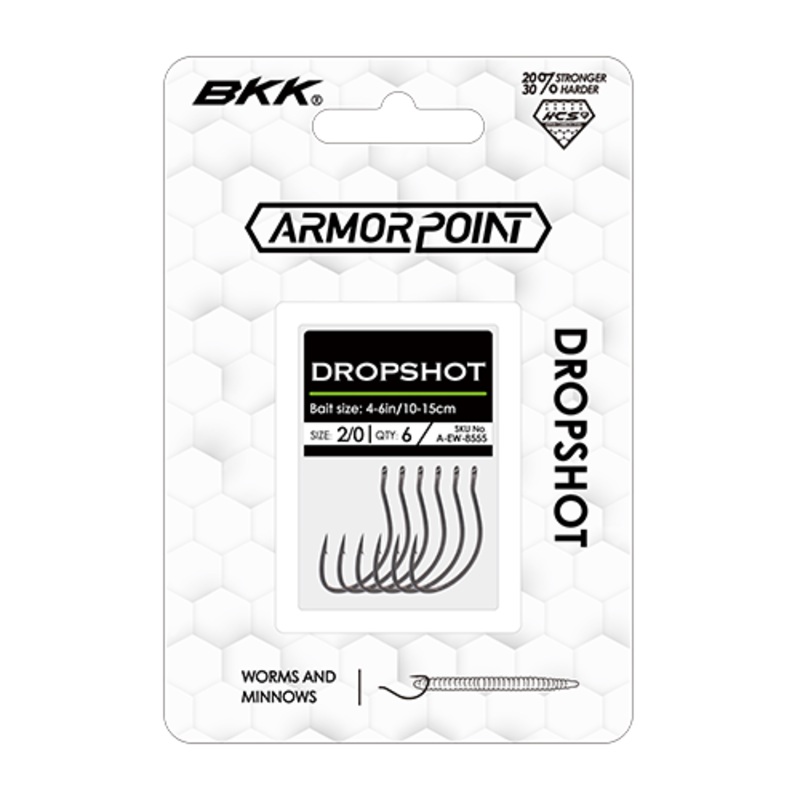 De BKK DROPSHOT is ontwikkeld voor het dropshotten en andere lichte stijlen van visserij. Deze haak is ontworpen om de staartactie van een neusgehaakte worm of minnow te maximaliseren en om in een optimale haakpositie te blijven bij verticaal vissen.