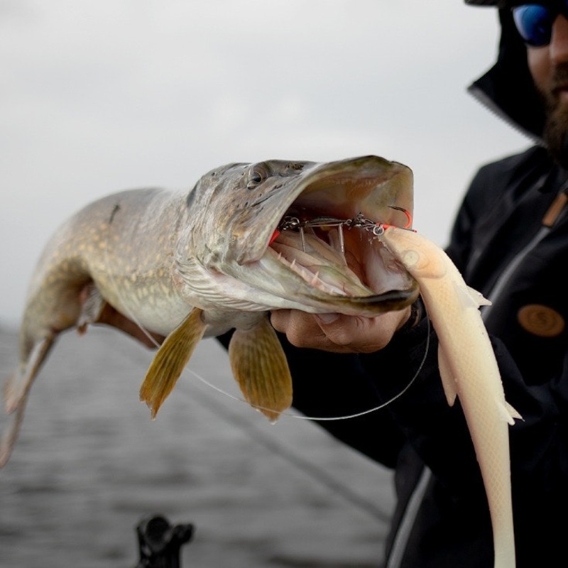 The BB Trigger-21 is BKK’s stinger rig for big soft baits developed in collaboration with Black Bay Lodge. Undergone through extensive testing with numerous big Irish pike, this stinger rig boasts a set of features that re-defines the concept of a stinger rig: Front spring to secure the rig onto the bait Tempered stainless steel components for robustness and extended durability Stiff structure that perfectly adheres to the bait profile Pins covered in plastic material to secure the rig to the bait body BKK Spear-21 treble hooks for unparalleled penetration Stainless steel swivels to buffer torsional forces Pairable with the BB lead system to adjust the sinking speed and pattern of the bait (2.5g lead included in the package) It comes in multiple sizes to suit a wide variety of soft baits. Adding the BB lead along the rig also stabilizes the swimming action of the lure and enhances its attractiveness during the fall. Ideal for stop-and-go retrieve. Size range 1/0 to 4/0, available also fit with Spear-21 UVO.