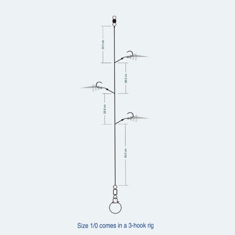 The series Hyper Flash B1 features BKK Octopus Beak hooks. Each hook carries shimmering fibers to boost the presentation of the rig and that come in 3 different colour combinations: yellow tang (chartreuse), smoking salmon (pink), flying fish (blue-silver). Available and tied with 80lb (2 hooks) line.