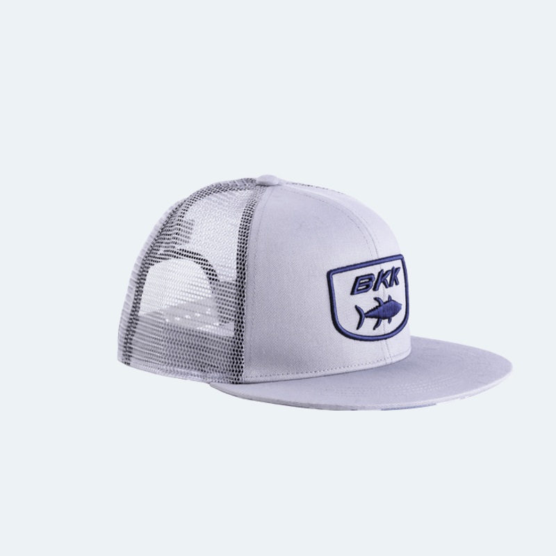 The BKK Tuna Snapback Hat is a lat-brim hat featuring a snapback-hat shape and a modern design in the front inspired and dedicated to tuna anglers. The mesh fabric ensures the necessary ventilation to be worn for the entire day out on the water. Three color combinations available: blue, grey and brown.