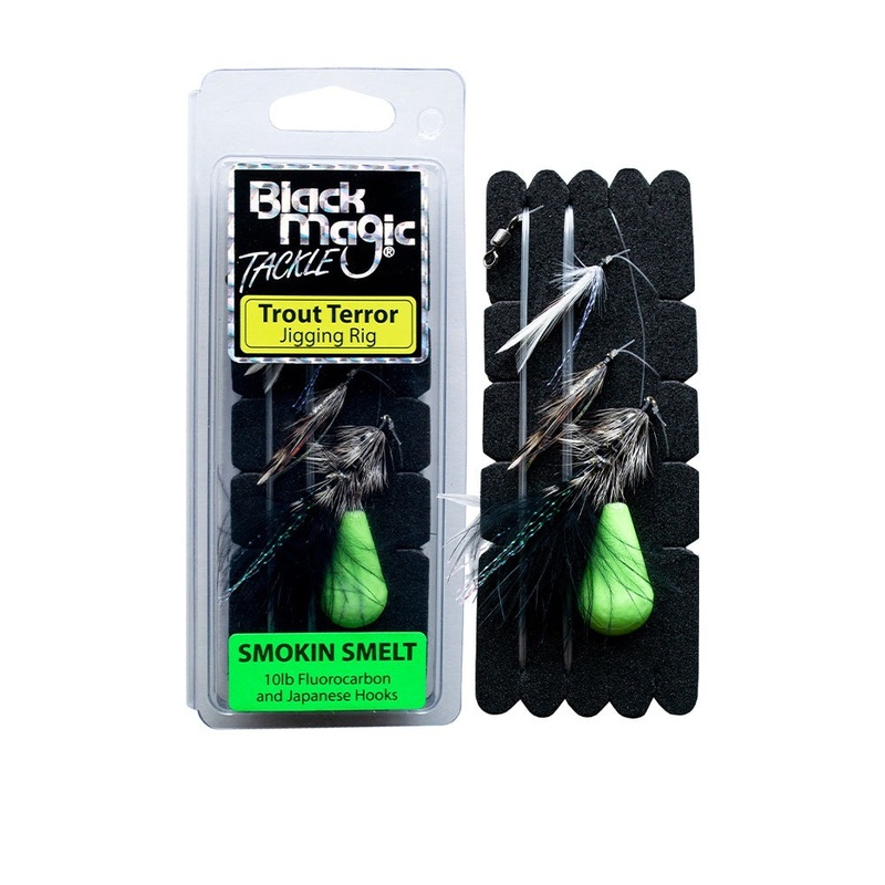 Keen on catching Trout? the Black Magic Trout Terror Fly Jigging Rig will get the job done! This jigging rig incorporates 3 flies that glide in the waters, enticing hungry fish to take the bite. Its decked out with premium materials including a Black Magic 10lb Fluorocarbon leader and high-quality Japanese fly hooks. The large 2oz lumo sinker also acts as a teaser to seduce larger Trout. Time to bring in the terror!