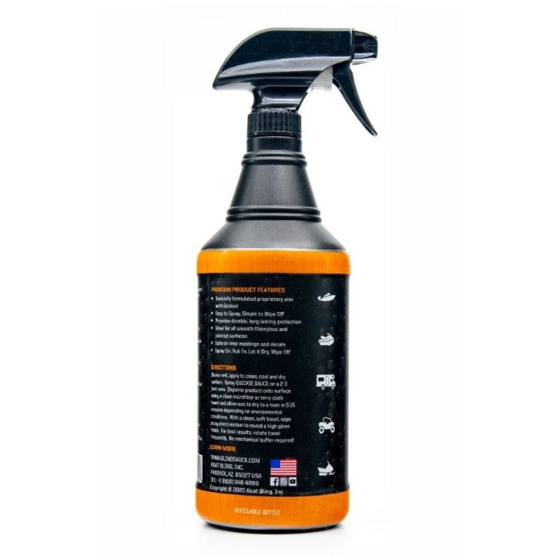 Quickie Sauce offers the protection of traditional paste wax yet can be applied in a fraction of the time. Perfect for fiberglass, painted surfaces, vinyl moldings and decals. Simply spray on, rub in and wipe off. The unique blend of Montan wax and sealant quickly dries to a haze during application. Once dry, just dust off the residue and your coat of Quickie Sauce wax sealant will keep your surface protected for months while the sealed surface makes future cleanup a breeze.