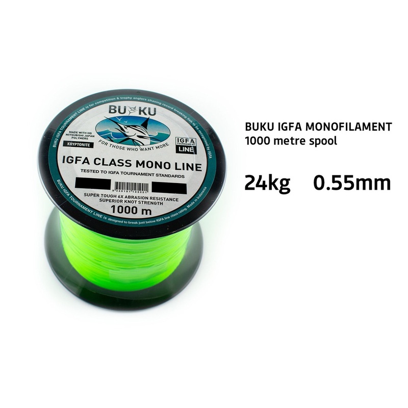 Buku IGFA monofilament game line is extensively tested during the manufacturing process to ensure that it meets all of the IGFA? stringent guidelines. Kryptonite is made with a vivid block colour which gives high visibility and reflection. This allows the angler to manage multiple spreads with greater ease, and can provide important information even when underwater.