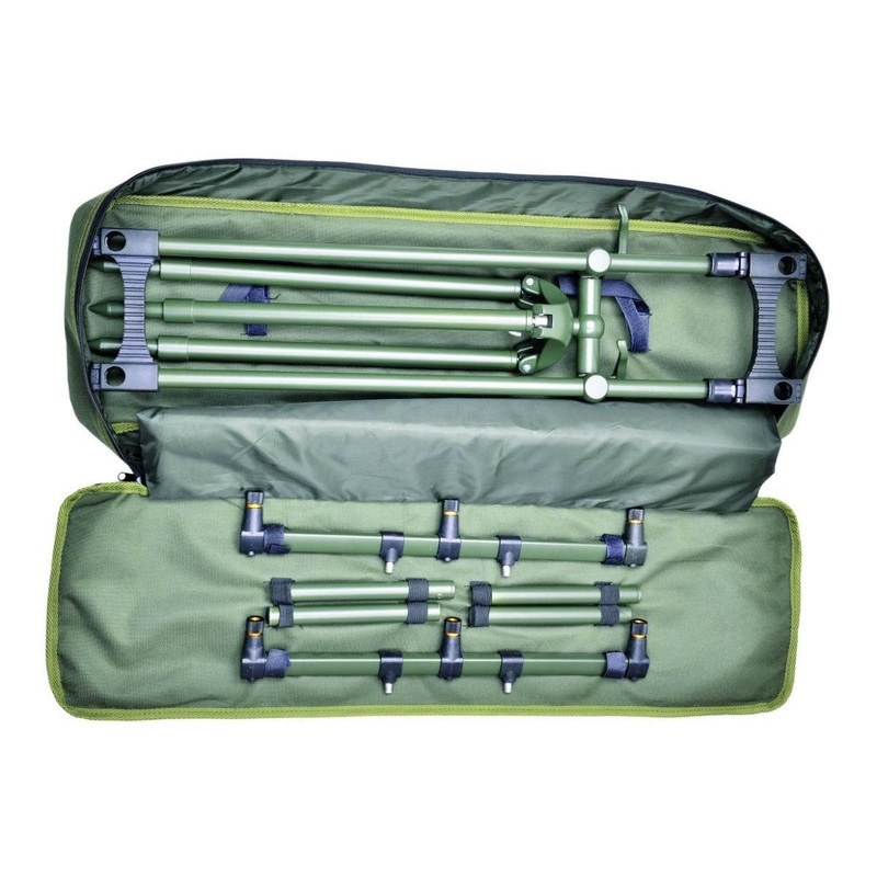 The Carp Zoom Fanatic-N3 Rod Pod is well-constructed with durable materials and is designed to hold up to three rods. Its frame and buzzer bars are composed of aluminum and feature a polished green finish. The rod pod comes with three legs that can be adjusted individually in length, allowing users to set up their rods on uneven ground. In addition, the pod is easy to assemble and comes with a protective carrying case. It’s a comprehensive rod pod that provides reliable performance at a competitive price.
