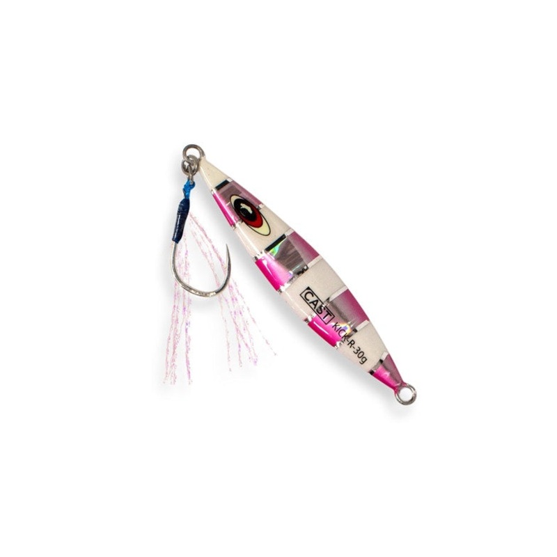 The Cast Kick-R Slow Pitch Jigs are somewhat of a hybrid slow pitch jig as they can also be worked at a fast pace without spinning out of control, which really opens up the fish you can target with them. All of the Cast Kick-R Slow Pitch Jigs come pre-rigged with quality Japanese-made Decoy hooks on YGK assist cord, which is premium quality that won’t let you down, so they’re ready to fish as they come. The Cast Kick-R Jigs have been upgraded with premium Japanese foil and chrome detail, plus ultra bright white lumo and an extremely durable finish to really upscale their quality. Use for snapper, red emperor, trout and other reef species as a normal slow pitch jig, but you can also target faster moving pelagics like kingfish and mackerel simply by working them up from the depths faster.