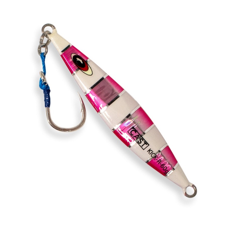 The Cast Kick-R Slow Pitch Jigs are somewhat of a hybrid slow pitch jig as they can also be worked at a fast pace without spinning out of control, which really opens up the fish you can target with them. All of the Cast Kick-R Slow Pitch Jigs come pre-rigged with quality Japanese-made Decoy hooks on YGK assist cord, which is premium quality that won’t let you down, so they’re ready to fish as they come. The Cast Kick-R Jigs have been upgraded with premium Japanese foil and chrome detail, plus ultra bright white lumo and an extremely durable finish to really upscale their quality. Use for snapper, red emperor, trout and other reef species as a normal slow pitch jig, but you can also target faster moving pelagics like kingfish and mackerel simply by working them up from the depths faster.