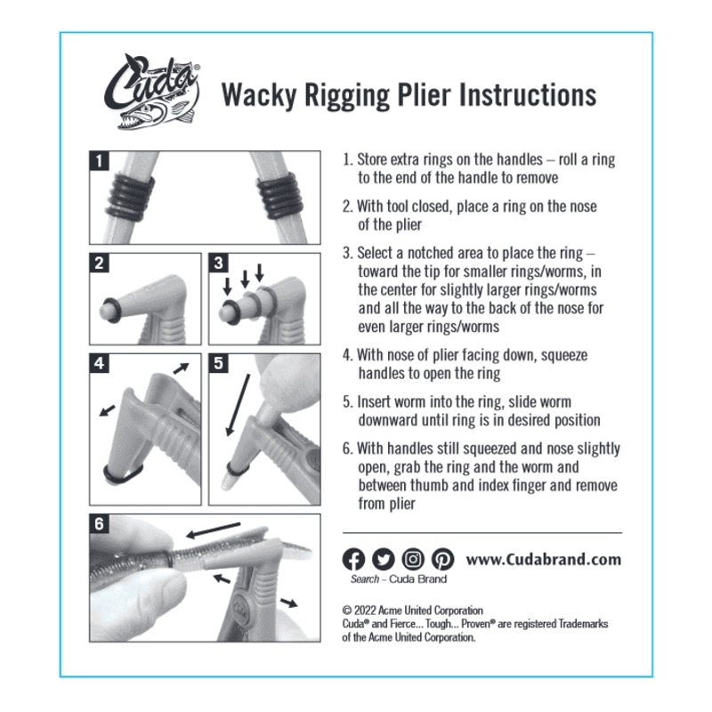 Perfect for easy wacky rigging. With 3 notches for various sized rings, simply place the ring on a notch, squeeze the handles to open the ring, place the worm through the ring to desired position, release and remove. Works with standard O-rings, includes 10 rings and has corrosion-resistant construction.