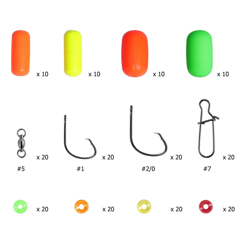 • Contents: Includes 40 snell floats, 20 #7 ball bearing swivels(Strength test 49LB), 20 #5 duo-lock snaps(Strength test 88LB), 20 #1 circle hooks, 20 #2/0 circle hooks, and 80 1/7″ beads. Everything sorted in a small tackle box for easy storage.