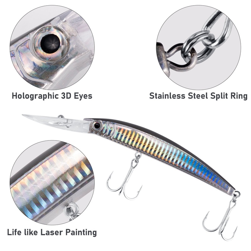 1. Minnow Deep Diver Lure: Holographic foil spine that reflects any and all subsurface light for the utmost visibility, even at maximum depths and in turbid or stained waters that can attract a variety of predatory fish.