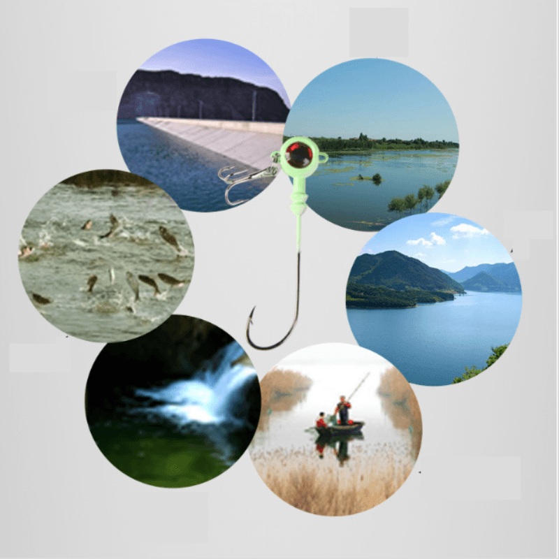 4. Easy to install your live baits or plastic. Make your soft plastic look like live prey. Eye jig head has sharp double barbs that can hold plastic securely.
