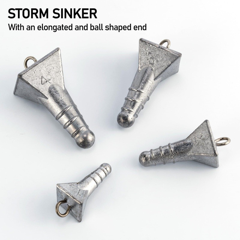 - The storm sinker is a modified pyramid fishing sinker, with an elongated and ball shaped endthat digs into the sand more and easier to retrieve.