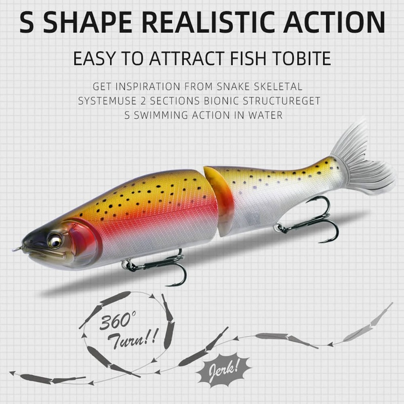 - Natural S-Shaped Swim: Two-section jointed body produces a smooth gliding motion in the water and imitates the movement of live fish to prompt strikes from predatory species.