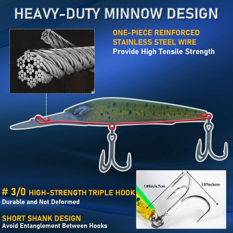 - EXTRA LARGE TONGUE DESIGN: Extra-large tongue of 7cm long and 3.1cm wide means that the minnow fishing lures can dive quickly while allowing the body to produce a larger and more vivid swing, making the swimming posture more agile than a regular Minnow.
