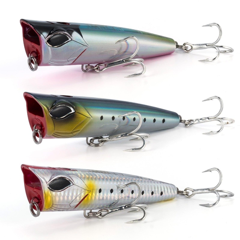 - Upgraded Popper lure: Open mouth collides fiercely with water. Bubble chamber design makes it more commotion than traditional popper. Built-in balance weight for more natural and stable movement. Highly simulated 3D eyes. Lure body adopts a new laser coating effect, with good reflection and strong allure. Easily causing crazy attacks from fish.
