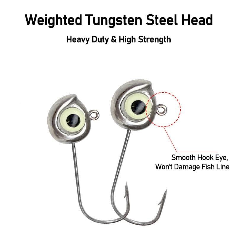 These jig heads feature a life-like appearance, which includes a bionic fish head profile and luminous 3D fish eyes. This combination of details are irresistible to fishes.