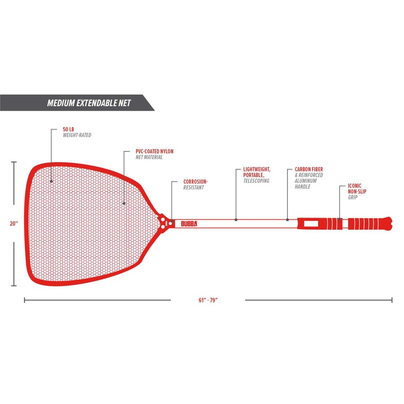 When it comes to landing the fish of a lifetime, an extra reach can mean the difference between heartbreak and celebration. The BUBBA Extendable Net keeps you from coming up short. The telescopic design allows for easy storage when collapsed and extends an additional 18 with the push of a button. Designed to fit most rod holders, the handle features our Iconic, Non-Slip Grip for a secure hold. The PVC-coated, nylon net material offers added protection for fish and prevents hook tangles. Corrosion-resistant and weight-rated for 50 lbs, the BUBBA Extendable Net is constructed from carbon fiber and reinforced aluminum for the ultimate combination of strength and durability.