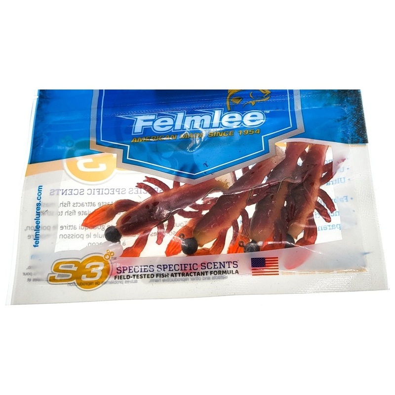 The Felmlee Lures Crayfish lure features a natural motion and S3 species specific scents for added attraction. Crayfish lures are a fisherman’s favorite. This crayfish features jig hooks, so they can be worked on the bottom.