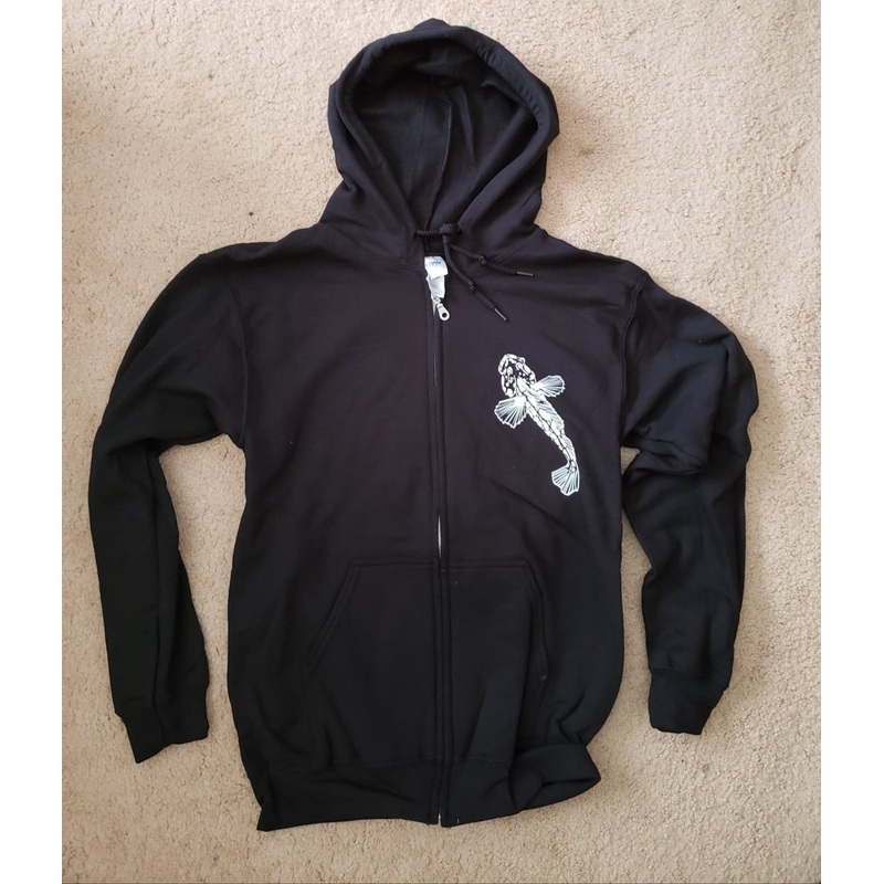 Zip-up hoodie with a Lingcod on front and the Fishermans Life Logo on the back.