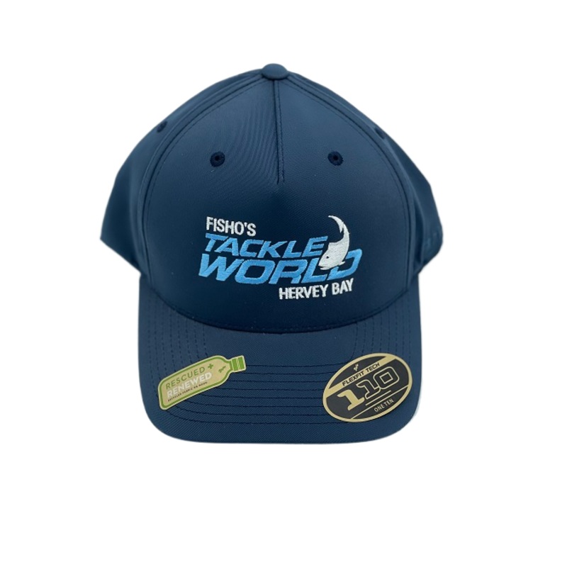The Fisho’s Tackle World Cap A Frame Recycled Navy features a 110 Flexfit snapback design, made from recycled fabric or mesh for sustainable style and comfort.