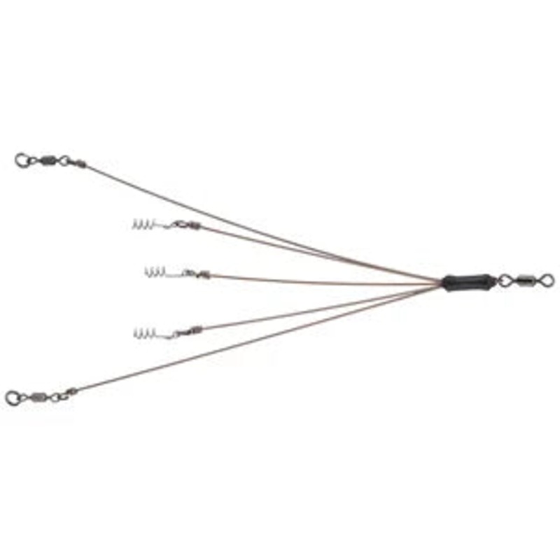 Featuring three short wires on top for teasers and two longer wires on bottom for hooked baits, this configuration balances the rig and funnels fish towards the hooked baits. In addition, the wires are hand-selected to be the perfect thickness, which lets your baits come to life with small rod twitches, but also gives you the strength to confidently flip giant fish into the boat.