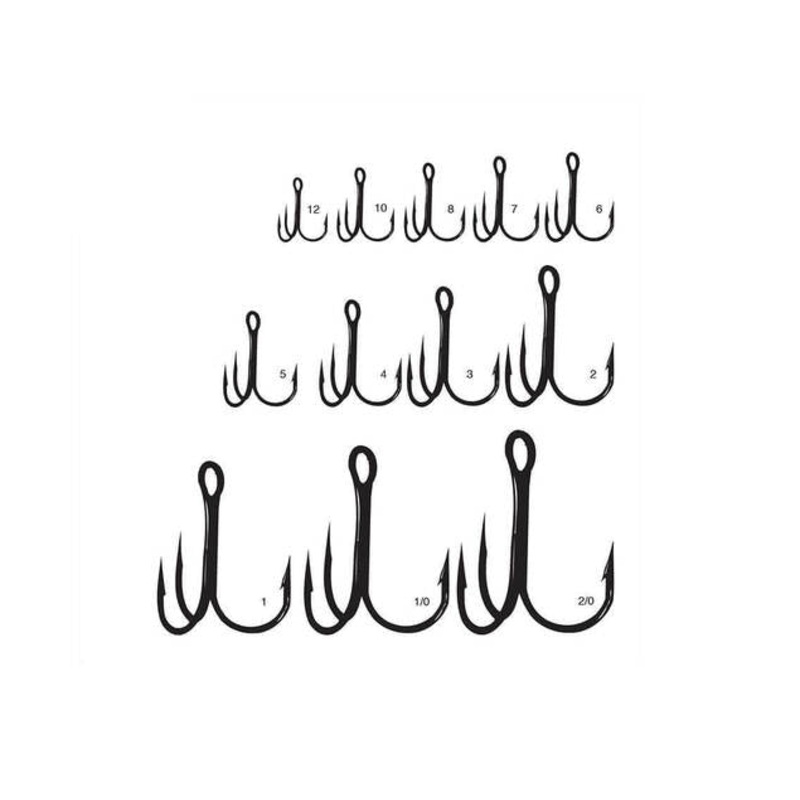 Hook Type Hook Size Per Pack Treble 1/0 6ct Treble 2 9ct Treble 2/0 5ct Treble 4 11ct Treble 6 12ct Treble 8 12ct