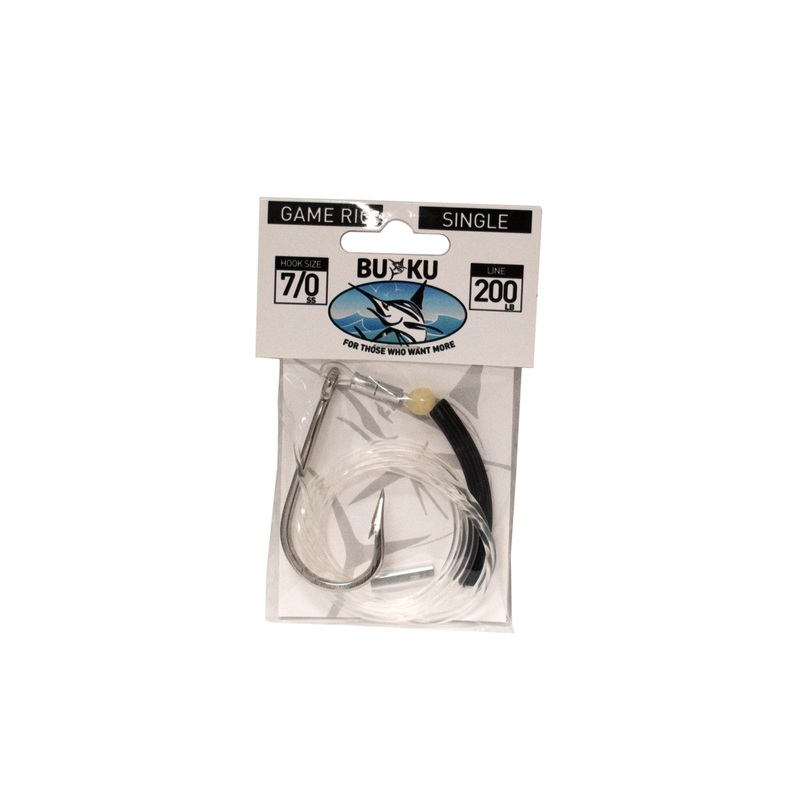The Buku Single Hook Game Rig is ideal for rigging trolling skirts and lures. The Buku Single Hook Game Rig is ready to go straight out of the packet equipped with 200cm of monofilament leader line, Shinto pro stainless steel game hook with cutting point, rigging tube, beads and crimps.