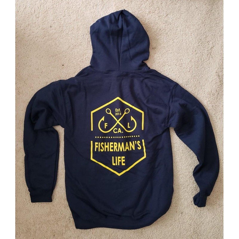 Youth zip-up hoodie with a Lingcod on front and the Fishermans Life Logo on the back.