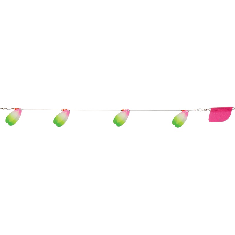 The Bolo Troll’s four-blade design is built around the unique Luhr-Jensen Bolo blade. Almost like two blades overlapped, the Bolo design spins in wide circles, offering brilliant flash and vibration, even at slower trolling speeds. Multiple sizes allow the Bolo Troll to suit waters from smaller ponds to large reservoirs. A built-in trolling rudder eliminates spin. See Tech Report #5: Lake Trolling Trout Techniques.