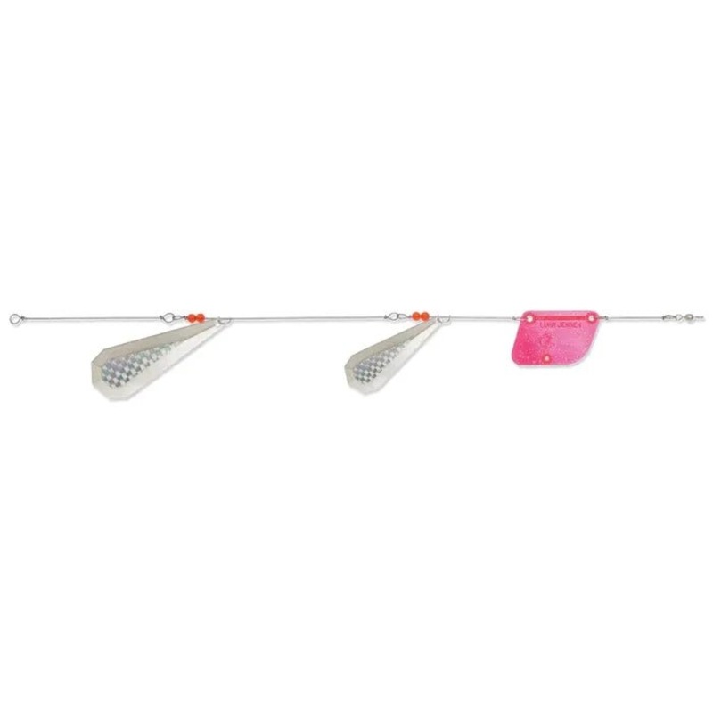 The Luhr-Jensen Model T Ford Fender is a 15-inch lake trolling rig with one size 8 top blade, one size 9 bottom blade, and a trolling rudder. Originally fashioned in the 1930s from the headlight reflector of a Model T Ford, few fishing products in the world have as long as respectable a history as the Ford Fender Lake Troll. Trolled at slow speeds, the Ford Fender produces maximum flash and vibration that draws fish from extremely long distances.
