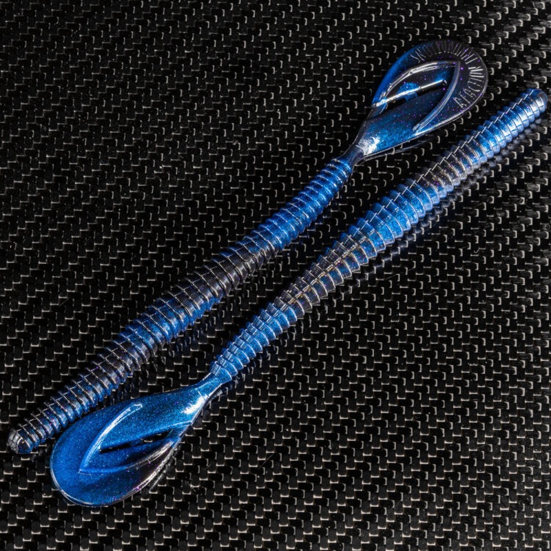 The Machete is a swimming worm that throbs like a spinner bait coming through the water. Designed with a vertical rib on the tail which grabs more water and also keeps the tail from tearing at the cut. The tail is also held together with two tabs. Leave them together and the Machete is a subtle do nothing worm, remove the first tab and it will give you more of a wobble, break both tabs to unleash the beast!