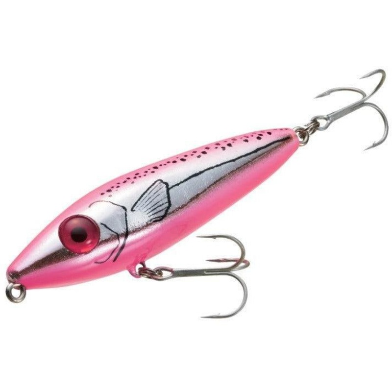 Molded from “space age” plastic the She Pup features twin “sonic fish calling” rattles. Each emits a high frequency sound which enrages game fish into monstrous strikes. High buoyancy allows great “walk-the-dog action” which anyone can master. Both freshwater and saltwater game fish find this lure irresistible.