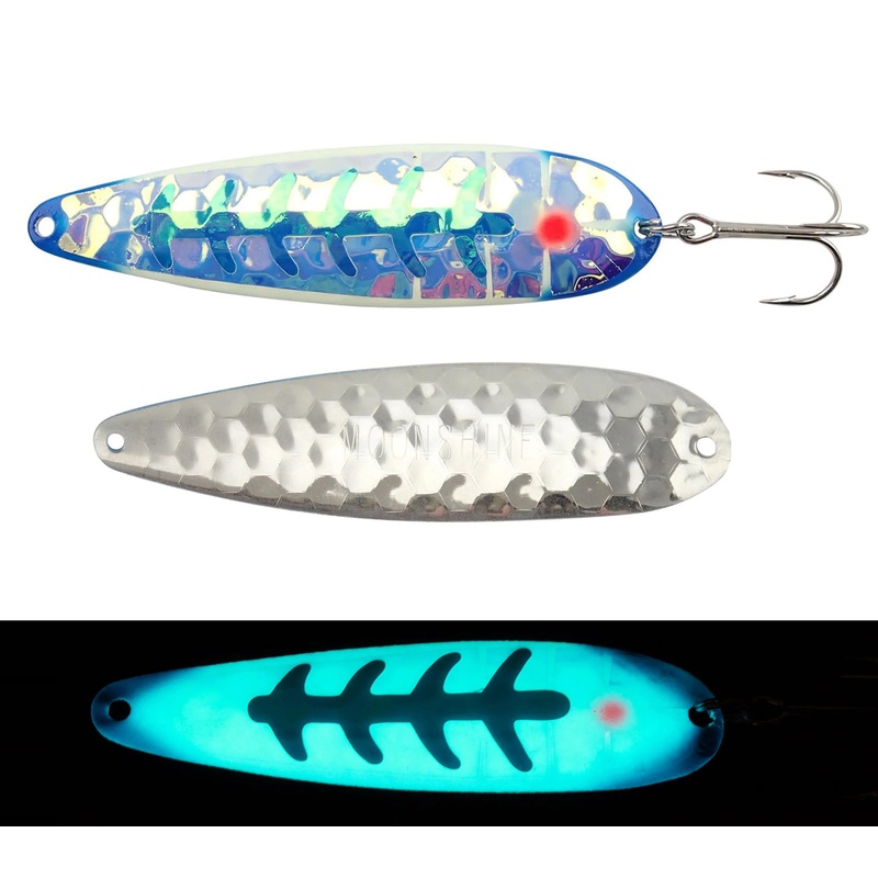 The Moonshine Lures RV Series Trolling Spoon delivers a realistic wiggle action that will encourage trout, salmon, steelhead, and many other species to attack. This spoon is painted with a patented glow paint to create a presentation of glow colors that is irresistible to fish. The Moonshine RV Series Spoon is produced from a family-owned and operated business that offers a high-quality product.