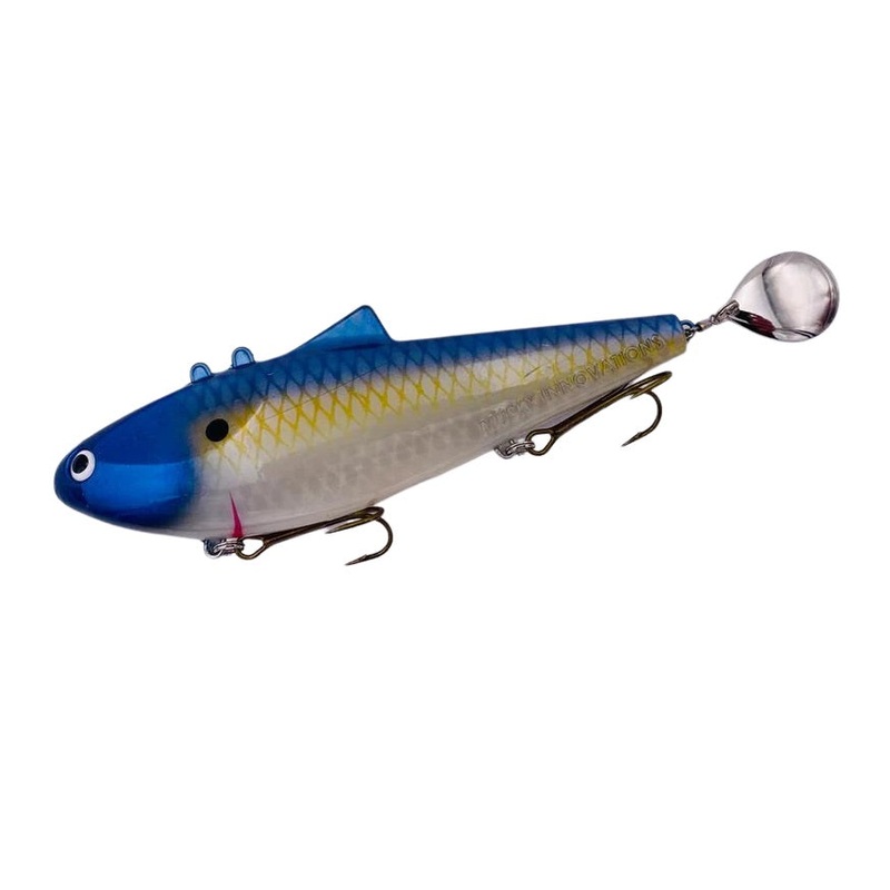 is a new versatile musky or pike lure that can be used for casting or jigging. It is 10″ long with the blade (8″ long body) and has (2) 4/0 hooks. Great wobble on the fall, blade thumps when pulled or ripped, and 2 line ties for different action or an optional stinger hook. Weighs 6.8 oz