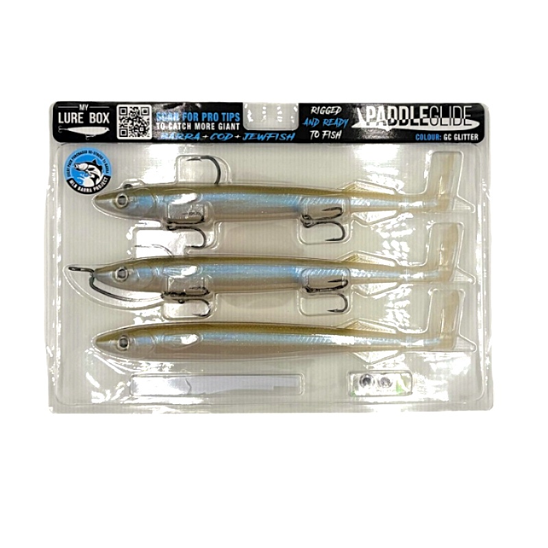 The Paddle Glides swimbait is the ultimate ready-to-fish lure, designed for targeting big barramundi, Murray cod, and jewfish. Featuring three bodies, two fully custom-rigged setups, and a versatile weight system, it allows retrieval at any depth and speedtopwater paddling, slow rolling, suspended gliding, deep rolling, trolling, or burning. Built tough with a balanced design, it comes with a 1oz jig, heavy harness, unweighted Super EWG, slow sink inserts, and spare accessories, ensuring maximum adaptability and performance straight out of the packet.