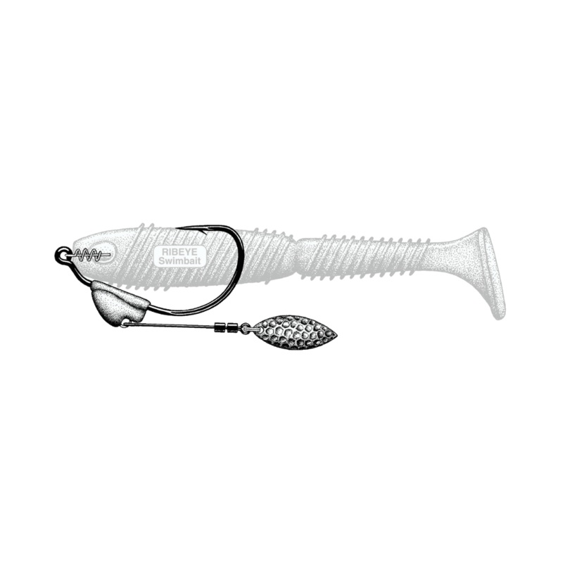 FLASHY SWIMMER with Owner’s TwistLOCK Centering-Pin Spring (CPS-patent pending) is a unique setup for rigging soft swimbaits, flukes, and other swimming plastics. The spinner blade is attached to a non-moveable weight that keeps a rigged soft plastic perfectly for use as an ideal search bait. In lieu of spinnerbaits or crankbaits, the flashy swimmer can be used as an alternative to cover a lot of water in a short time. A multitude of presentations can be achieved by switching baits and the speed of retrieval. The added weight helps sink or swim the rigged bait down into the strike zone, while the blade adds a fish-attracting flash. The wire pivots where attached to the weight, but the design of the molded lead keeps the wire and blade riding horizontally during a steady retrieve. Attached to the wire is a #3 hammered nickel-finished willow leaf blade, rigged with a dual mini swivel. Other features include a TwistLOCK Centering-Pin Spring (CPS-patent pending) attached to the hook eye, an open gap for more positive hook sets, an XX-strong forged shank, Super Needle Point, and black chrome finish.