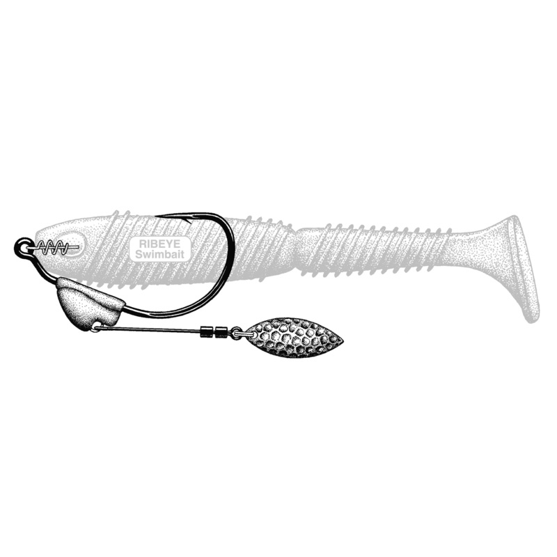 FLASHY SWIMMER now with Colorado blades, feature Owner’s TwistLOCK Centering-Pin Spring (CPS-patent pending) which is a unique setup for rigging soft swimbaits, flukes, and other swimming plastics. The spinner blade is attached to a non-moveable weight that keels a rigged soft plastic perfectly for use as an ideal “search” bait. In lieu of spinnerbaits or crankbaits, the flashy swimmer can be used as an alternative to cover a lot of water in a short time. A multitude of presentations can be achieved by switching baits and the speed of retrieval. The added weight helps sink or “swim” the rigged bait down into the strike zone, while the blade adds a fish-attracting flash. The wire pivots where attached to the weight, but the design of the molded lead keeps the wire and blade riding horizontal during a steady retrieve. Attached to the wire is a Colorado blade, rigged with a dual mini swivel. Other features include a TwistLOCK “Centering-Pin Spring” (CPS-patent pending) attached to the hook eye, an “open” gap for more positive hook sets, a XX-strong forged shank, Super Needle Point, and black chrome finish. Available in regular and Beast versions.