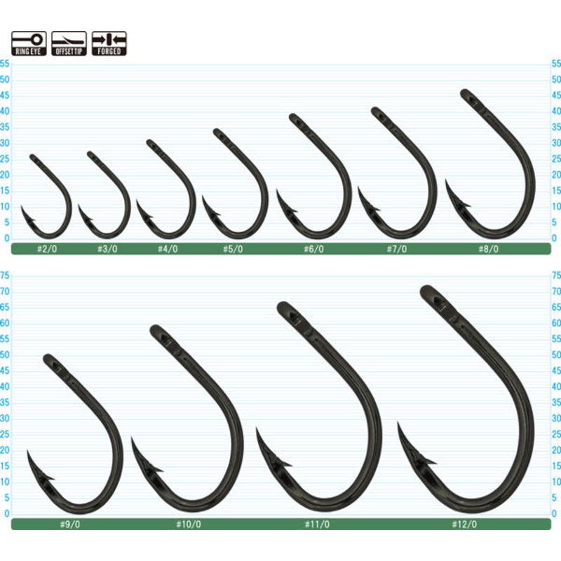 Known for its totally unique “mean” blade-like, curved, sticky-sharp, offset point. Sizes 8/0 – 12/0 are available with out rings. Features include, super needle point, forged point, XX-strong wire, and black chrome finish.
