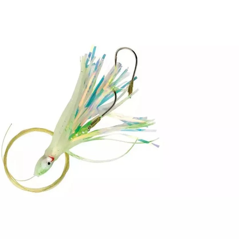The P-Line Rigged Squid with Tinsel Insert is one tough rig! A P-Line rigged skirt is tied on 60″ of 30-lb. CXX X-tra Strong line is one of the toughest fishing lines out there. A 4-1/2″ UV-enhanced Sunrise Squid is then coupled with a Tinsel Insert. 6mm beads are then used as a spacer to two 5/0 hooks. Ideal for King and Coho, these rigged skirts are most effective when fished a short distance behind a flasher.