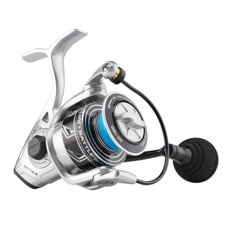 Penn Battle III DX Spinning Reels are built tough to withstand whatever the saltwater angler puts these reels through. The Battle III DX reels are more powerful than the previous Battle III spinning reels. Brass main gears are in every size along with an improved HT-100 drag system. Transfer more power through the gears to your big catch on the other end of the line with oversized EVA handle knobs.