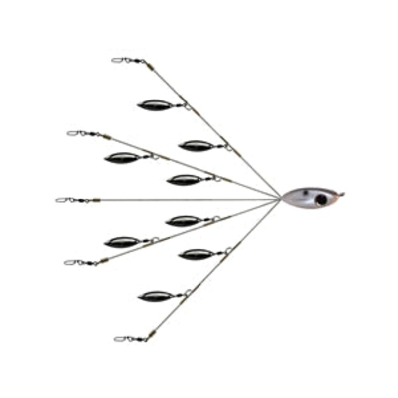The Picasso Flash Back is built with a 2-tier blade configuration consisting of eight #1 willow blades that imitates the shiny flickering commonly seen in baitfish schools. Constructed with low visibility brown wire that allows the fish to focus on the baits being presented instead of the distraction of flashy wires. The lightweight high- impact resistant plastic head and embedded nose swivel prevents line twist and also prevents the fish from leveraging itself off when hooked. No longer does a broken swivel render your Umbrella Rig useless and destined for the trash along with your hard earned money. Features the markets only SLIDING SLEEVE that allows for quick and easy replacement of any damaged or worn terminal swivels. This can be particularly critical during tournament situations when rigging up an entirely new Umbrella Rig can take up much needed time. Equipped with premium American made components including a 140lb strength nose swivel, and heavy duty terminal snap swivels of 75 lb strength to keep your swim baits secure and to assure landing the doubles and even triples that this rig commonly catches. This is a very versatile size than can be used for targeting suspended fish or throwing around docks, blow downs or other structure.