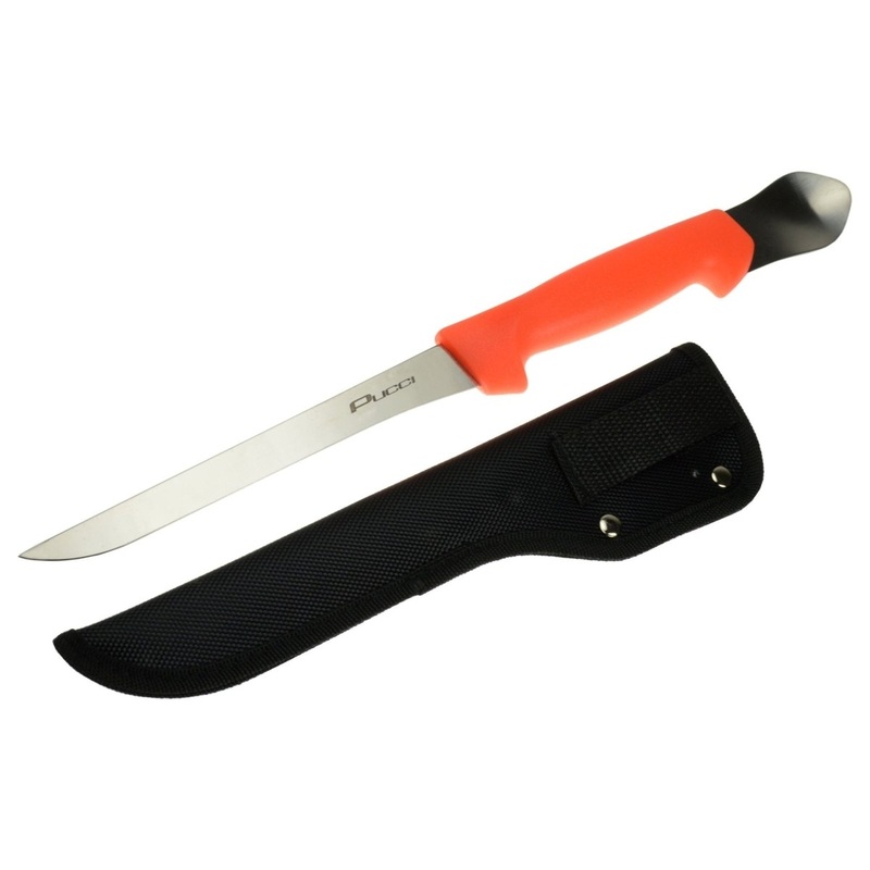 Stainless Steel Fillet knife has a spoon shaped design on the butt of the knife for cleaning bloodlines.