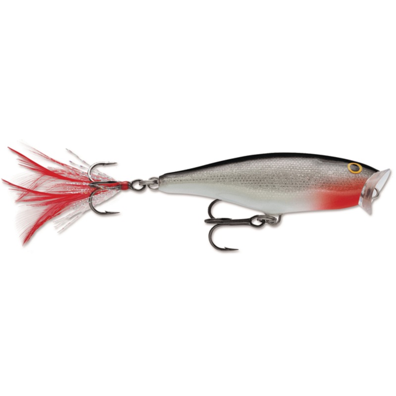 The Rapala Skitter Pop Elite is a dependable lure designed for big perch, aspius, and pike. With its weighted tail and premium balsa construction, it casts far and skips through the topwater making loud and deep pops. Its reinforced construction and modern freshwater and saltwater finishes make it a durable choice.The Rapala Skitter Pop Topwater Hard Lure is designed with a cupped lip and painted and chrome finishes for maximum angling performance. It is finished with VMC black nickel hooks, and a feather/tinsel dressed rear treble hook for superior attractability. This 9cm, 14gm lure is sure to be your go-to topwater fishing option.