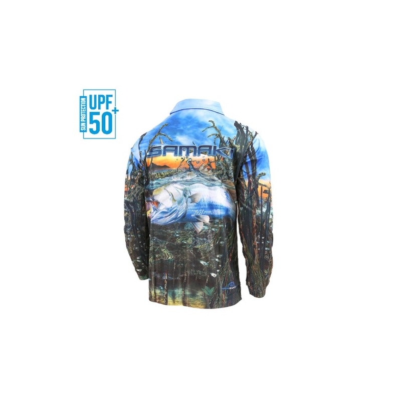 Samaki’s extensive range of long sleeve fishing jerseys not only look outstanding, they are UPF 50+ Rated for the ultimate in sun protection. With a huge range of styles to suit your favourite target species, stay cool and look cool on the water year-round. Samaki fishing shirts have been created for you to wear on the water, in the shade or out to your favourite restaurant. The lightweight fabric is comfortable and smooth on the body, allows air flow in the heat and UV sun protection in the outdoors. The lightweight fabric is perfect for all outdoor elements, protecting you from the harsh sunrays with our UV50+ resistant technology, the soft touch material is comfortable on the body plus has the added feature of being breathable keeping you cool and dry. FEATURES > UPF 50+ Rated – Excellent sun protection fabric > Available in kids, youth and adult sizes > Full length long sleeve collared fishing shirt > 3 button chest > Exclusive 3D artwork design
