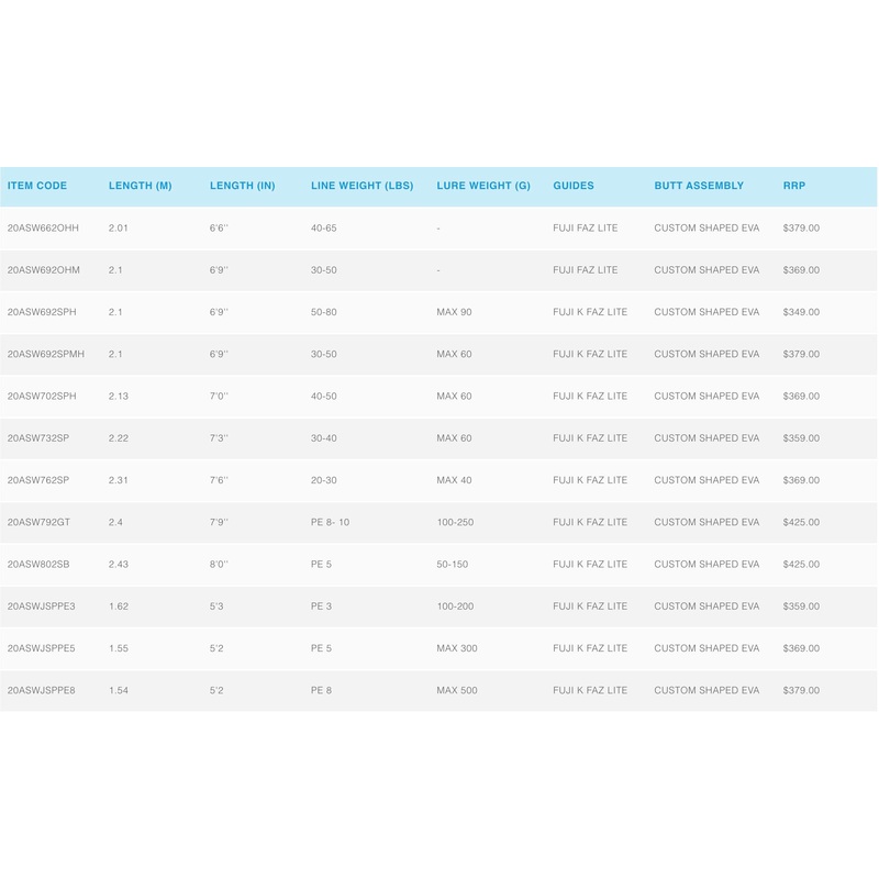 The Anthem SW series is a dedicated sportfishing series of rods that feature 12 purpose-built models for Australian conditions with 2 overhead, 6 spin, 2 stick bait and 3 jigging models. Built tough to handle any unforgiving saltwater species, Shimano’s durable and lightweight TC4 blank construction has been used, which ensures powerful performance when both casting and fighting a fish once hooked. Premium Fuji K Faz Lite guides have been fitted and the grip section features specially designed custom shaped EVA moulded grips for comfort and added grip. These rods are suited to be fished right along Australia’s saltwater coastline, whether it be GT’s on the northern reefs or southern bluefin busting up bait. 20ASW662OHH , 20ASW692OHM
