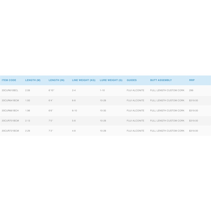 The Curado rod series is well known for its premium baitcast reels, now there is a series of rods to match. The Curado series comes with 5 baitcast models, that have been tailored to suit an array of lure fishing styles. The technology behind this series incorporates Shimano’s tough and durable X5 blank construction, which gives the rods a powerful yet sensitive blank. The guides feature Fuji’s premium Alconite frames sized to suit heavier leaders and full-length custom cork grips which offer great durability and sensitivity. If you are on the hunt for a series of rods that has you covered from flicking light lures for natives like bass and yellow belly, right up to chucking larger swimbaits and plastics for such species Murray cod and barramundi, the new 2020 Curado series perfect for you 20CUR6101BCL , 20CUR641BCM , 20CUR701BCM , 20CUR721BCM , 20CUR661BCH