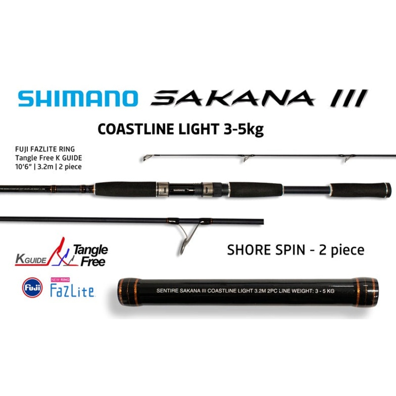 Super light weight fast taper blanks, all models are 2 piece, fitted with Fuji Tangle Free K-guides. 2 Shore Spin models are available suitable for estuary, rock and beach work. The design and performance of the Sakana 3 Shore Spin Series needs to be experienced. Shimano has produced a high quality range of fishing rods with attention to detail and functionality. Available now at Tackle World.
