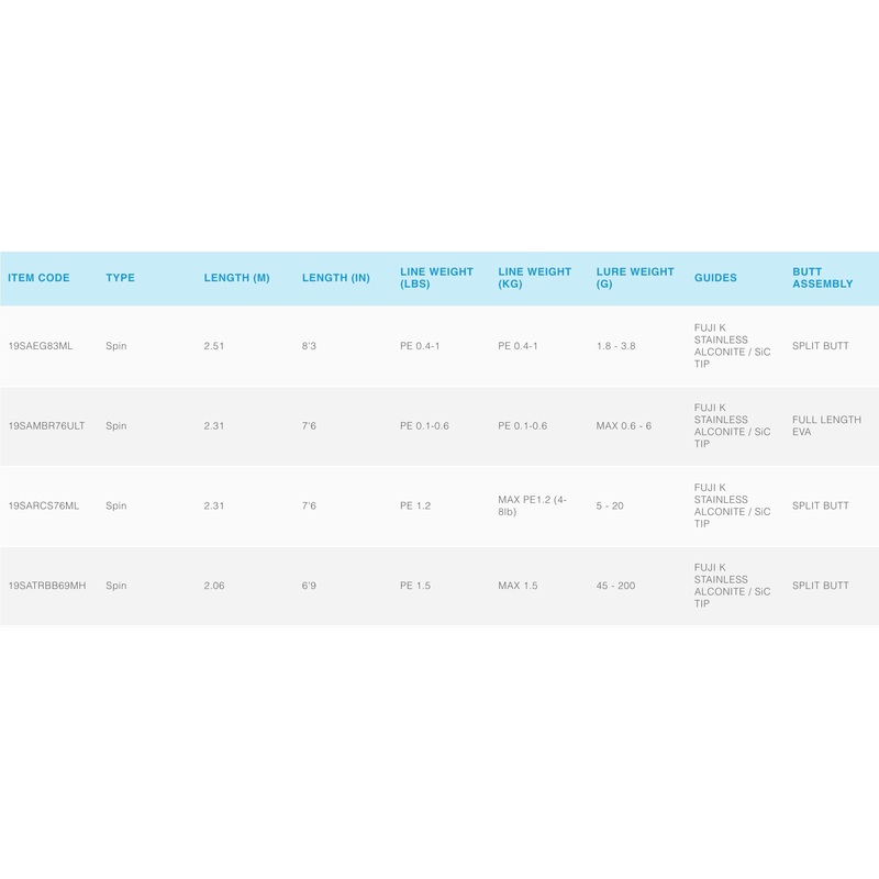 The Salty Advance range of rods has been purpose built for specific styles of lure fishing. With four technique specific rods in the range designed for rock, egiing, trout and Baku Baku style jig fishing. Built with Shimano’s High Response Solid blank and Taftec rod tips, the Salty Advance rods are light, sharp and powerful. These quality materials are super sensitive, yet sturdy, rod tips will make for awesome lure fishing. 19SAEG83ML , 19SATRBB69MH , 19SARCS76ML