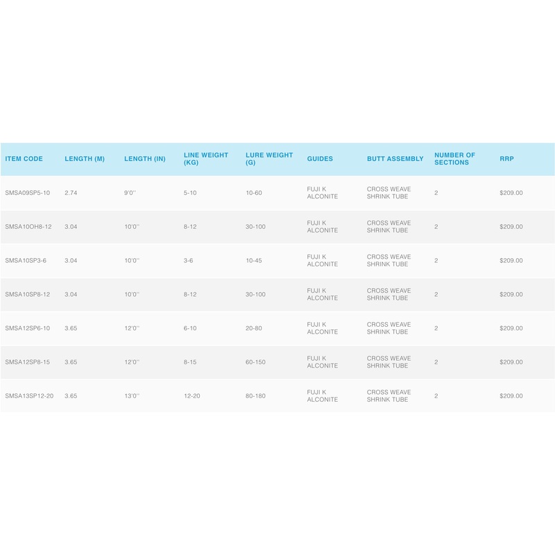 The new SpeedMaster Surf series of rods are built to deliver great land-based casting and fish fighting performance across 7 models. The blanks incorporate Shimano’s 24T Carbon blank construction, which provide the rod with great strength and casting ability. The butt configuration is designed for big pendulum casts and features a custom cross weave shrink tube grip, which aids in weight reduction whilst increasing grip and sensitivity. Fitted to the blank are Fuji K Alconite guides for enhanced casting performance which is vital when trying to achieve maximum distance from the shore. This series offers great versatility with 9’0, 10’0, 12’0 and 13’0 length models, with 1 overhead and 6 spin model. Rated across from 3-6kg to a whopping 12-20kg, and with varying casting weights from 10g to 180g, this series is purpose built for a wide range of land-based fishing styles. SMSA10OH8-12